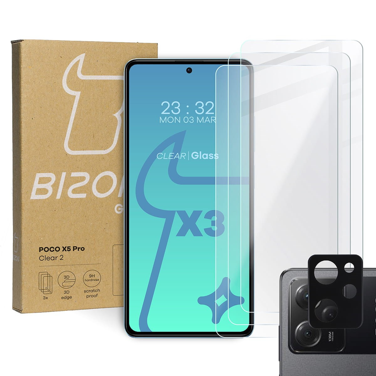 - 3x Szkło hartowane + szybka na aparat Bizon Glass Clear 2 Pack do Poco X5 Pro