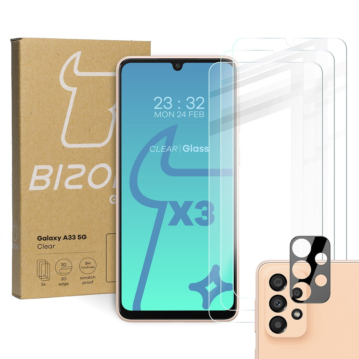 - Szkło hartowane do etui Bizon Glass Clear - 3 sztuki + ochrona obiektywu dla Galaxy A33