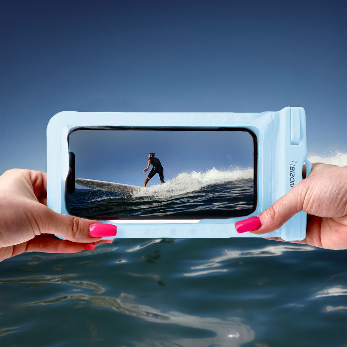 - Etui wodoszczelne na telefon, saszetka wodoodporna IPX8, etui na plażę do wody, etui na kajak, waterproof — nieważne, jak na to mówisz, ważne, że udało Ci się znaleźć Bizon Case Hydrowrap w kolorze jasnoniebieskim!