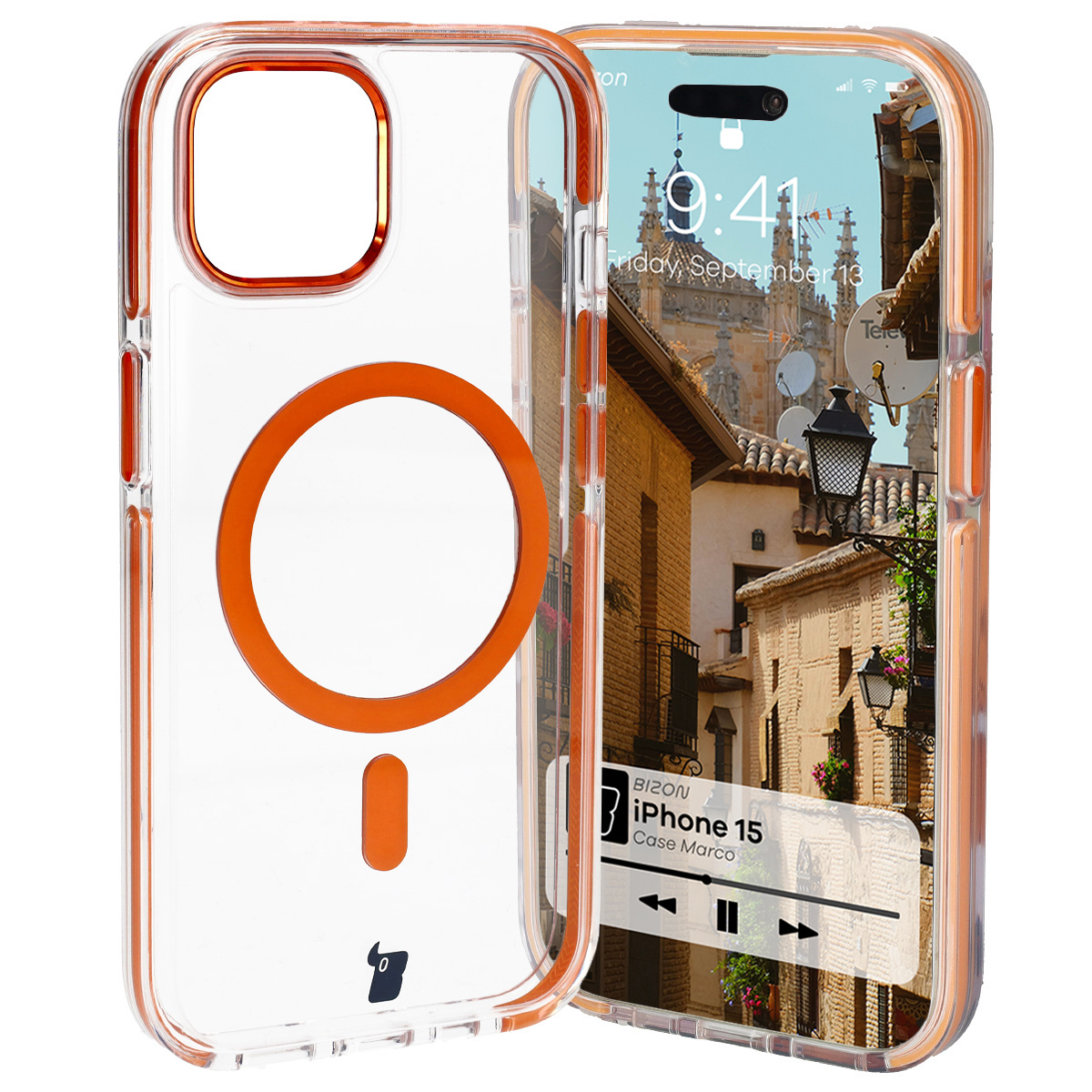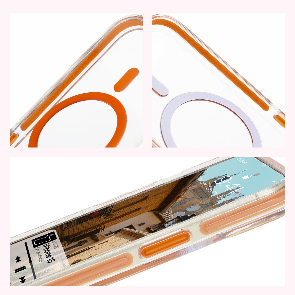 Etui z pierścieniem magnetycznym Bizon Case Marco do iPhone 15, przezroczyste z pomarańczową ramką