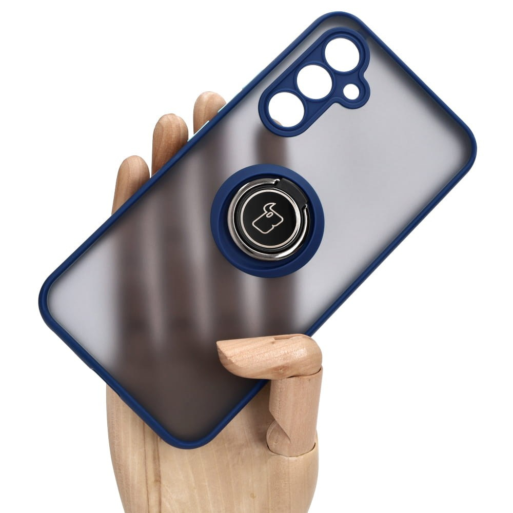 Etui z uchwytem na palec Bizon Case Hybrid Ring do Galaxy A54 5G, przydymione z granatową ramką