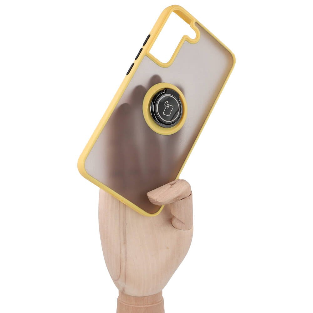 Etui z uchwytem na palec Bizon Case Hybrid Ring do Galaxy S22 Plus, przydymione z żółtą ramką