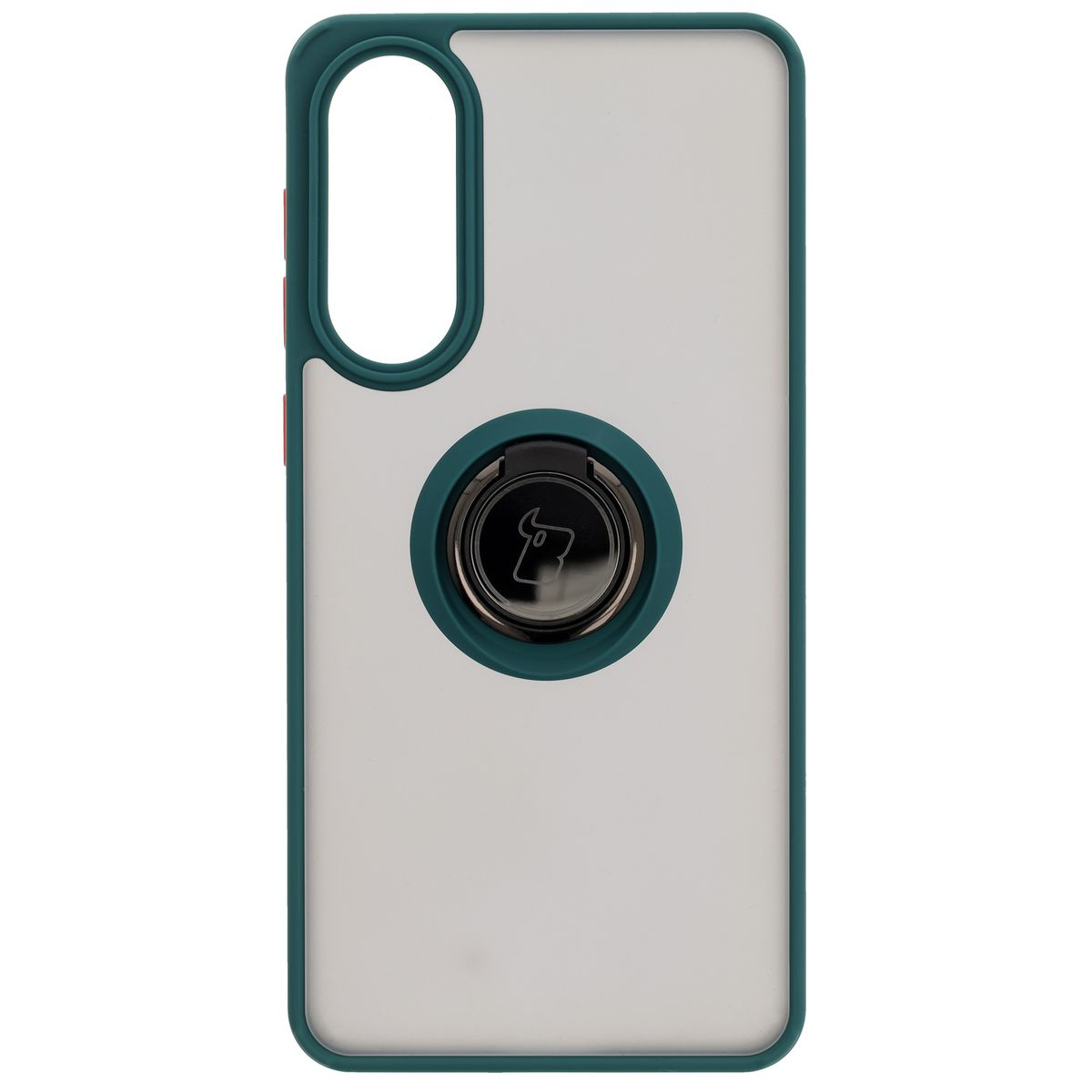 Etui z uchwytem na palec Bizon Case Hybrid Ring do Galaxy S25 Edge, przydymione z ciemnozieloną ramką