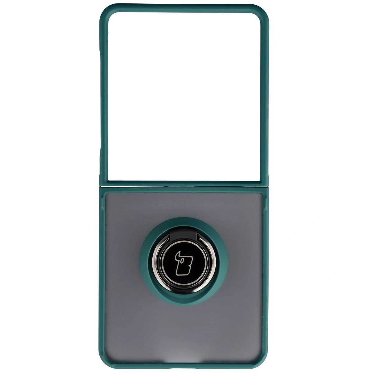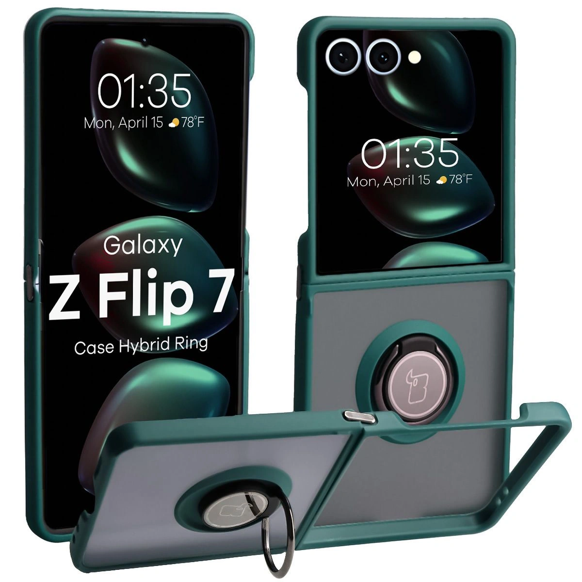Etui z uchwytem na palec Bizon Case Hybrid Ring do Galaxy Z Flip7, przydymione z ciemnozieloną ramką