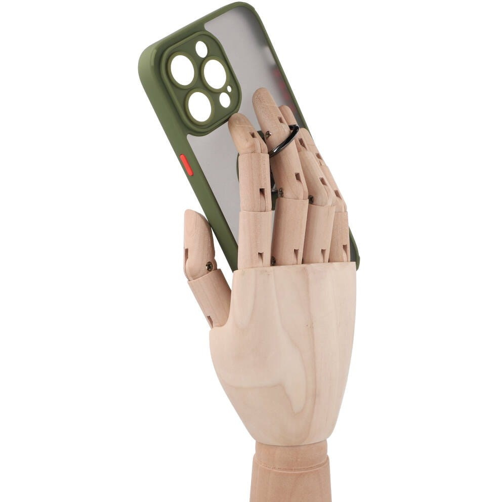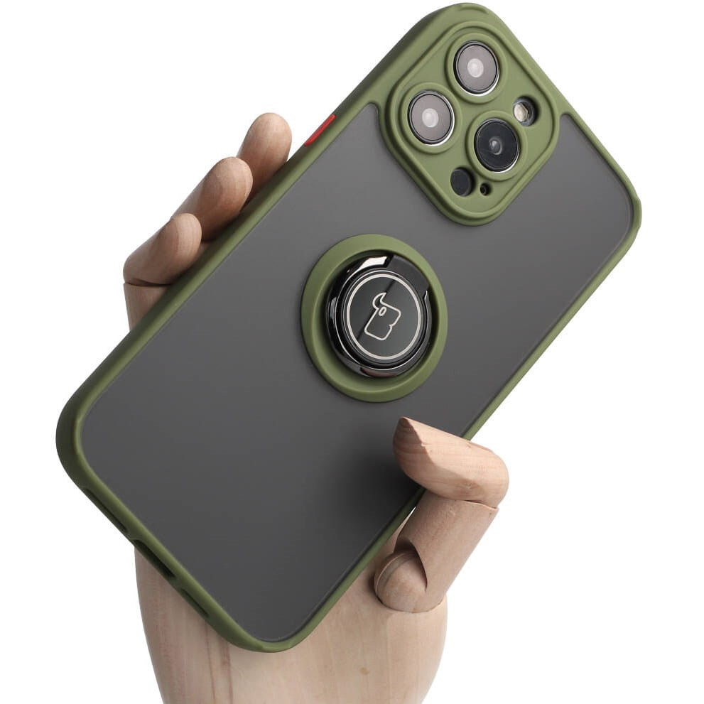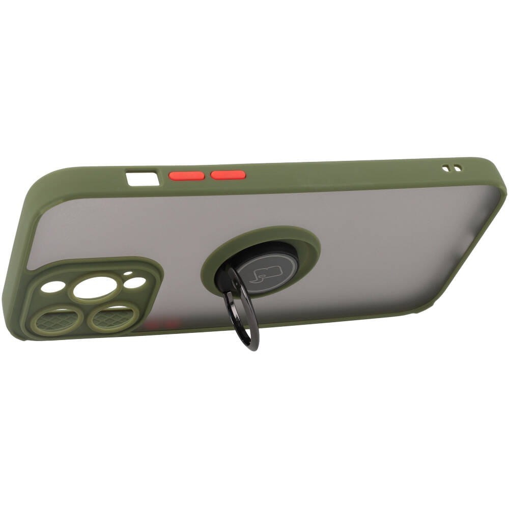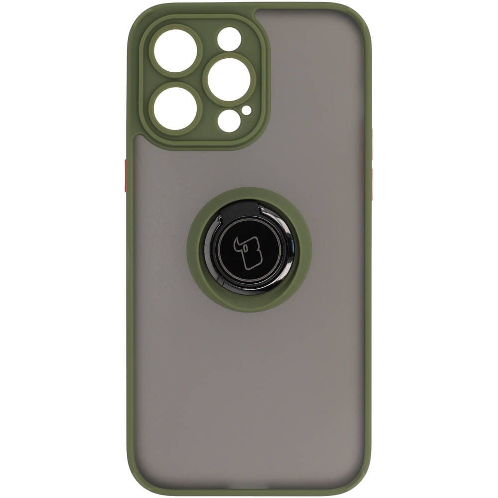 Etui z uchwytem na palec Bizon Case Hybrid Ring do iPhone 14 Pro Max, przydymione z zieloną ramką