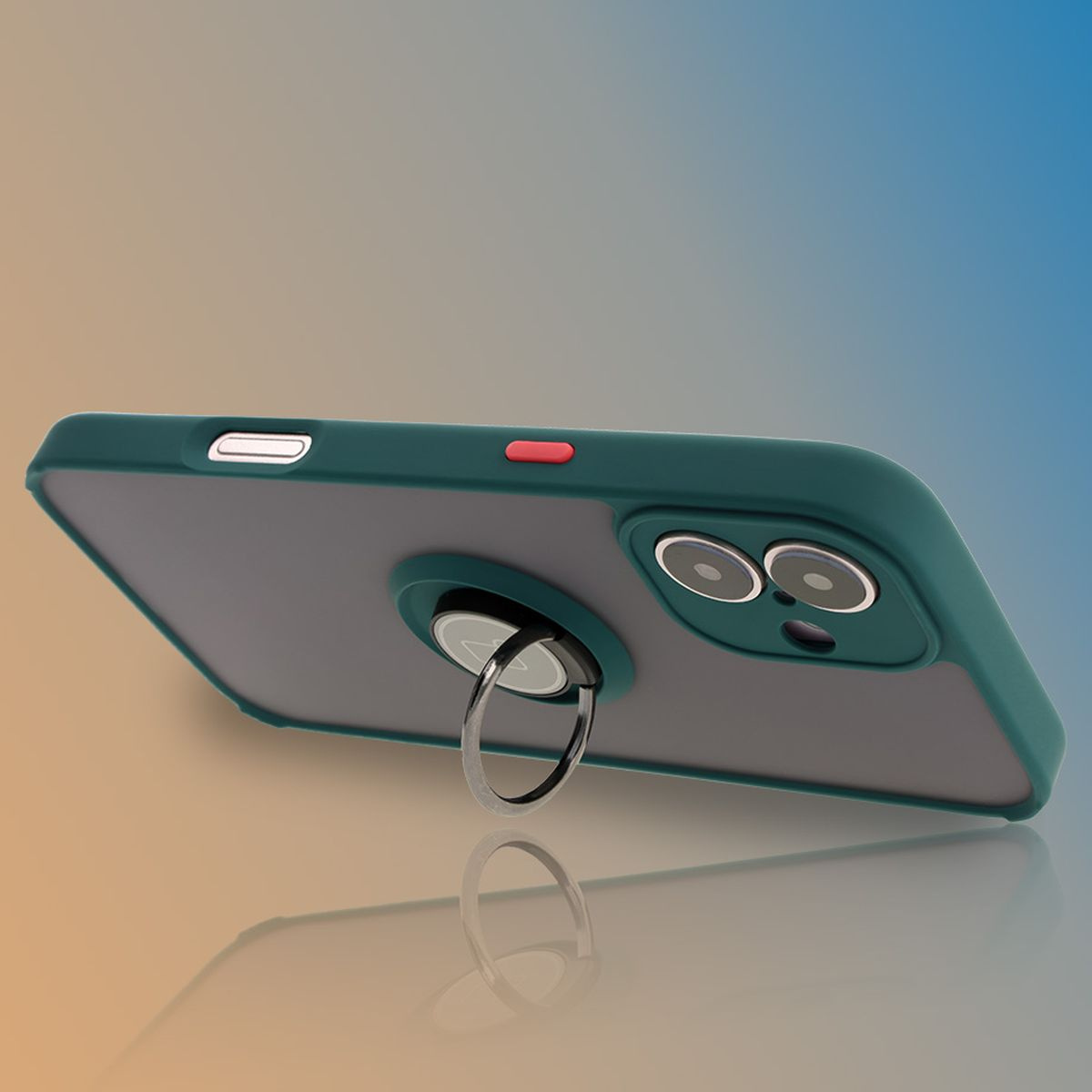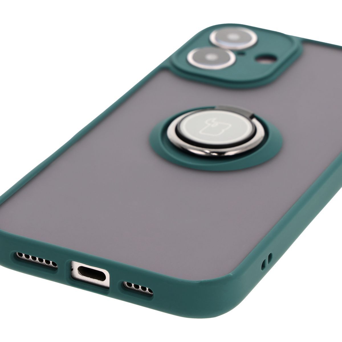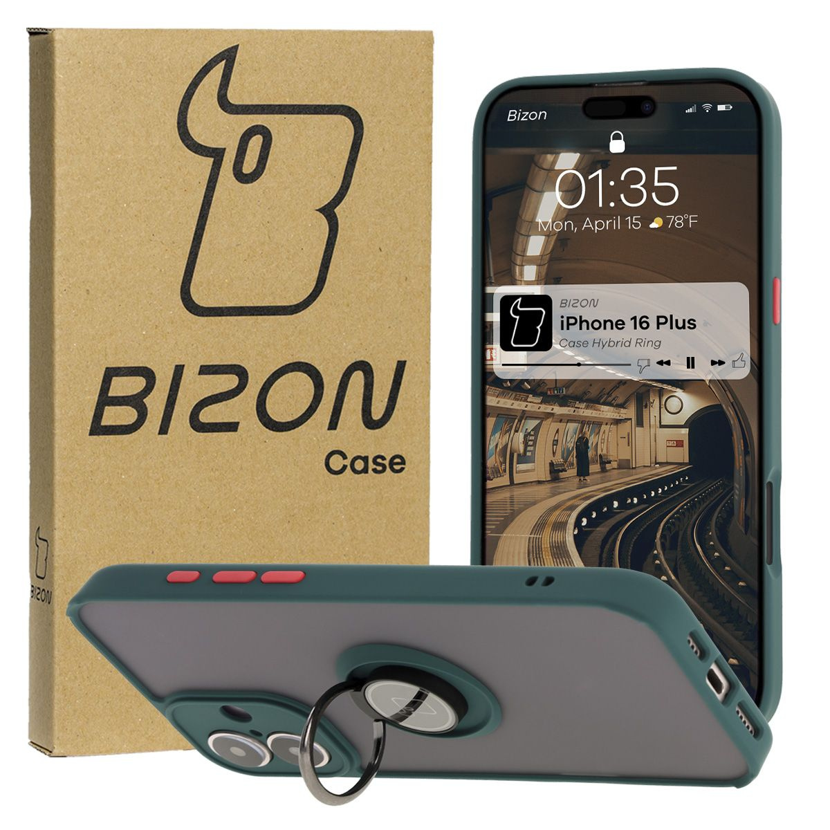 Etui z uchwytem na palec Bizon Case Hybrid Ring do iPhone 16 Plus, przydymione z ciemnozieloną ramką