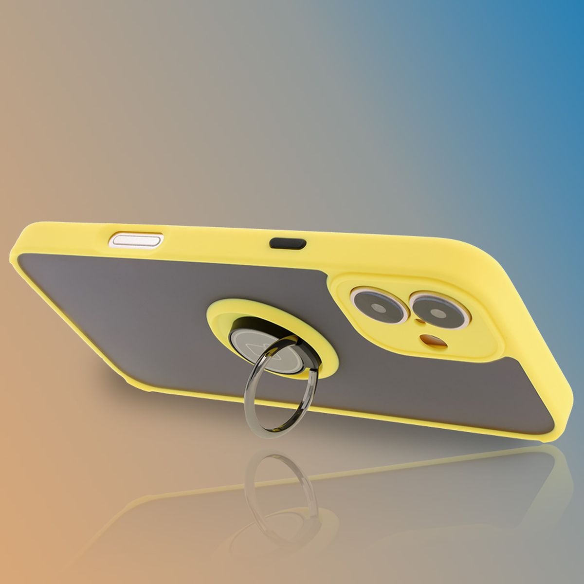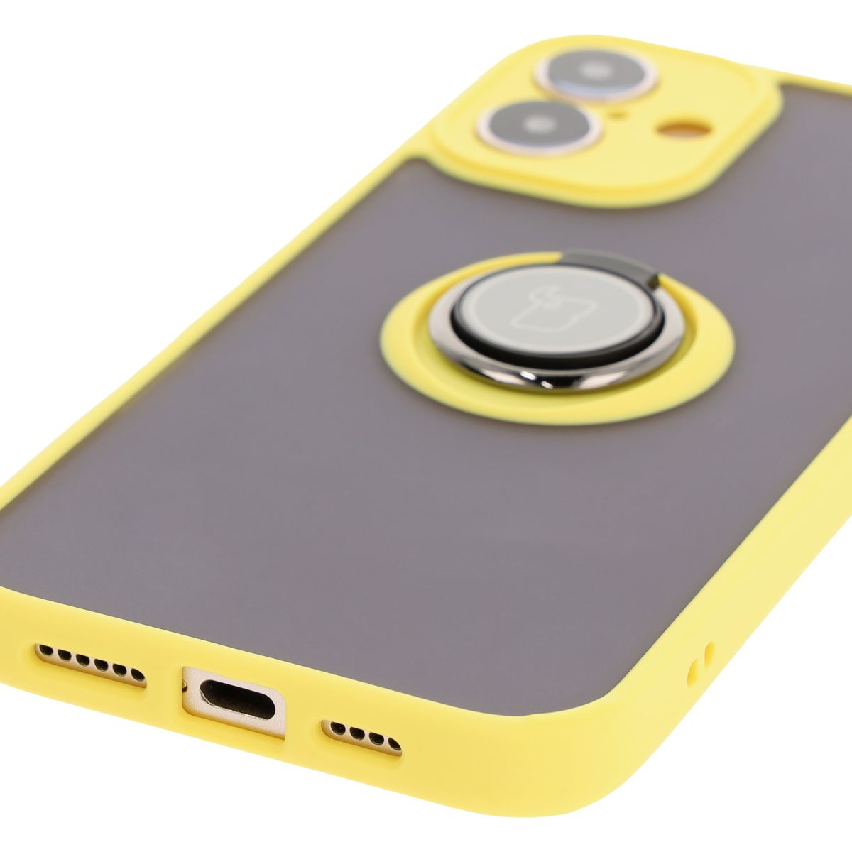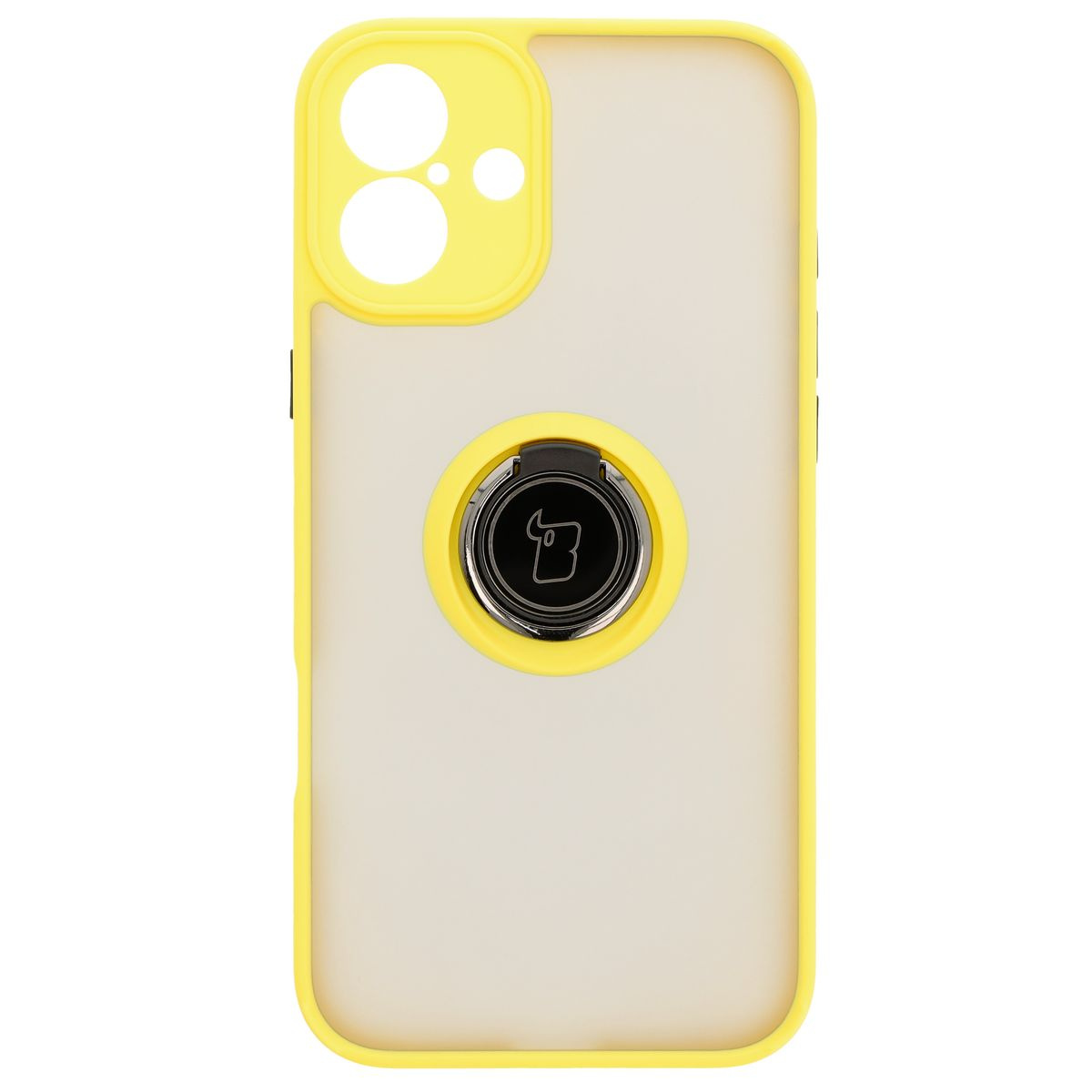 Etui z uchwytem na palec Bizon Case Hybrid Ring do iPhone 16 Plus, przydymione z żółtą ramką