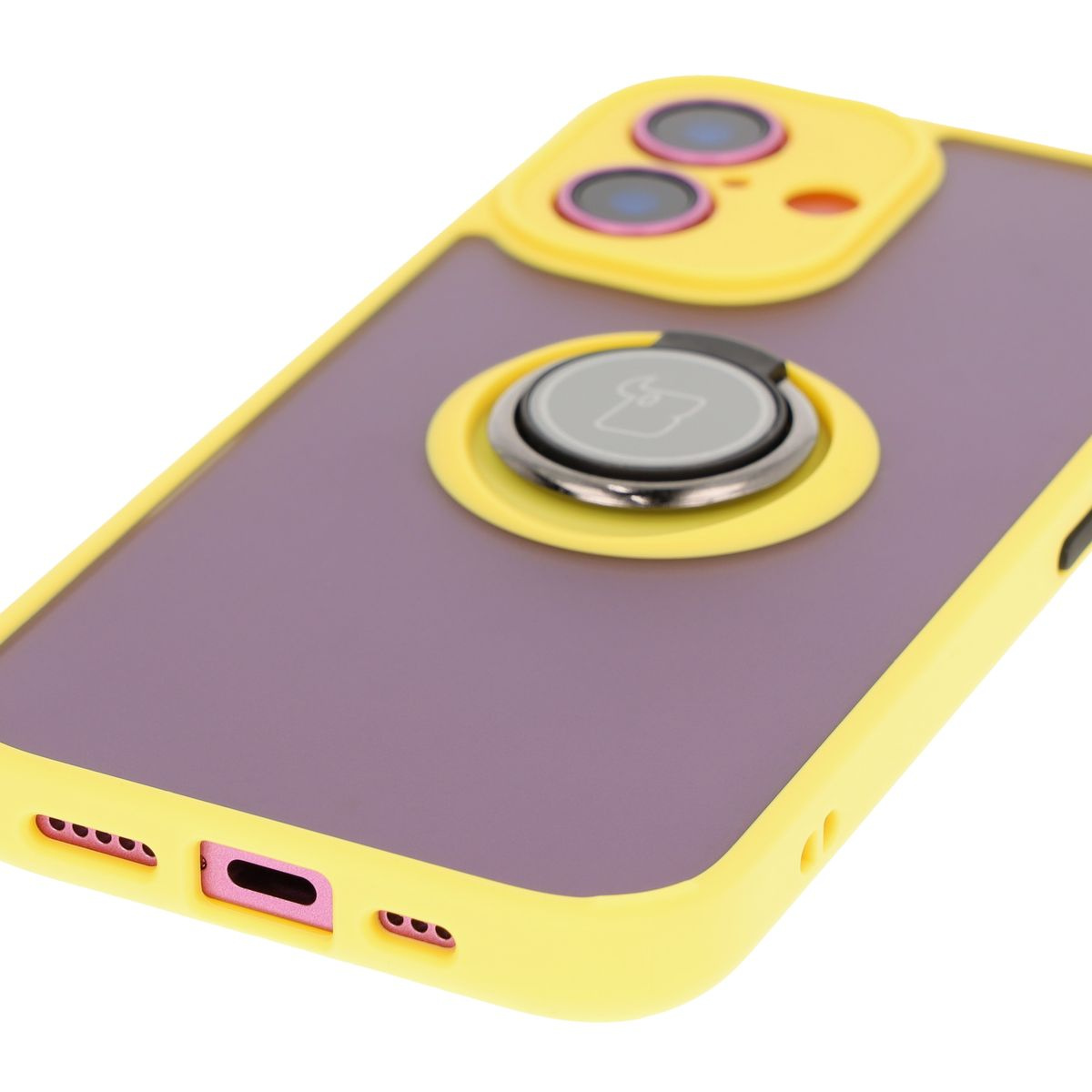 Etui z uchwytem na palec Bizon Case Hybrid Ring do iPhone 16, przydymione z żółtą ramką
