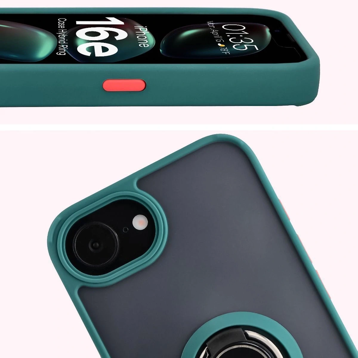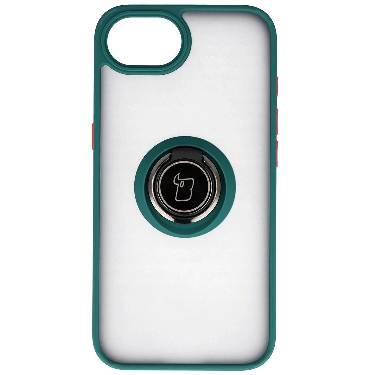 Etui z uchwytem na palec Bizon Case Hybrid Ring do iPhone 16e, przydymione z ciemnozieloną ramką