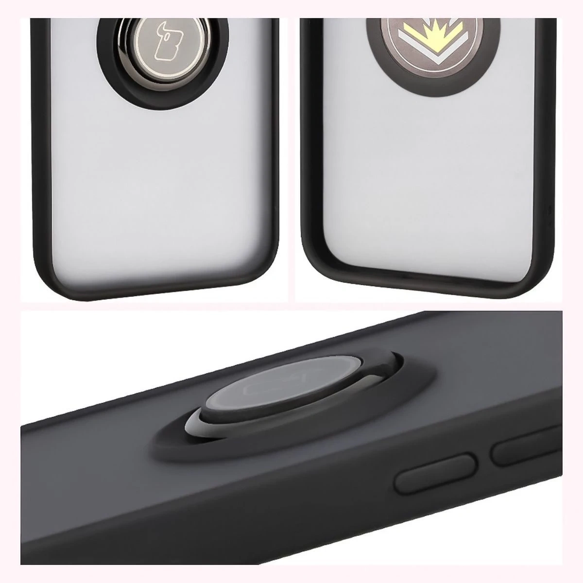 Etui z uchwytem na palec Bizon Case Hybrid Ring do iPhone 16e, przydymione z czarną ramką