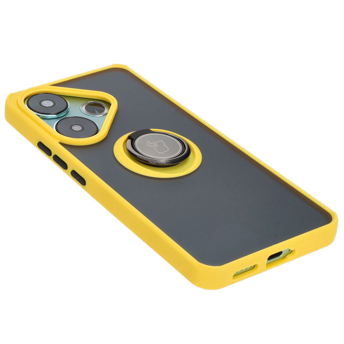 Etui z uchwytem na palec Bizon Case Hybrid Ring do Xiaomi Poco F6, przydymione z żółtą ramką