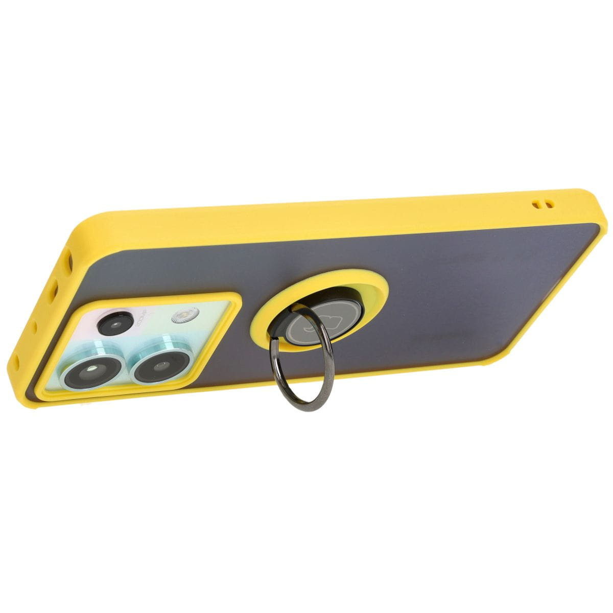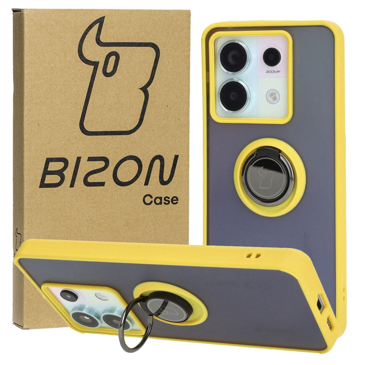 Etui z uchwytem na palec Bizon Case Hybrid Ring do Xiaomi Poco X6 / Xiaomi Redmi Note 13 Pro 5G, przydymione z żółtą ramką