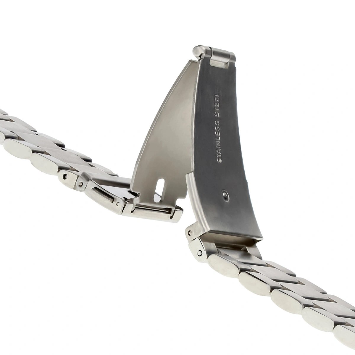 Bransoletka posiada klasyczne zapięcie motylkowe, które jest łagodne dla skóry i dyskretne, dzięki czemu opaska prezentuje się elegancko i harmonijnie. Pasek nie wpływa na funkcjonalność smartwatcha, a jego montaż jest bardzo prosty — wystarczy wpiąć łączenia do koperty zegarka i gotowe!